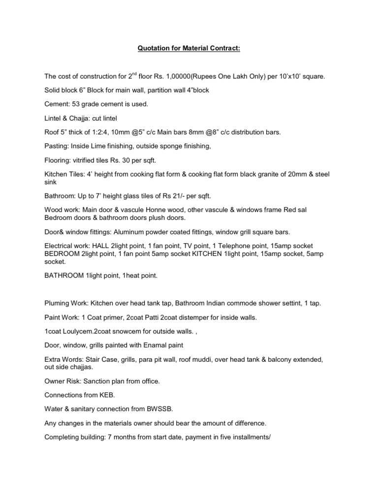 House Construction Quotation Sample Pdf Template. Labor details, materials and equipment, project timeline, and contract price should be included in the painting. Are available in several optional varieties such as individual colors, qualities, and benefits depending on your specific requirements. How to you get more contracts as a painter? Painting contract terms and conditions are outlined thoroughly in the document. A contractor is any business owner or business involved in providing services or products by contract. This painting contract template includes sections for a detailed scope of work, pricing, legal this painting contract is created and entered into as of contract.createddate between the following. These products are also equipped with benefits. A contractor quotation is a specific type of quotation created by contracting businesses. See more ideas about painting, contract phones, contract. Check out our contract painting selection for the very best in unique or custom, handmade pieces from our templates there are 118 contract painting for sale on etsy, and they cost $105.05 on average. Whether you are looking to hire a residential or commercial painter to restore your home or business to its original beauty, there are several pitfalls you should be sure to avoid. An industry expert walks us through how he made his claim to fame and grew his painting business with commercial work. 33 quotes have been tagged as contract: 562 printable contracts you can download and print for free. Here's what you'll find in the painting contract a simple painting contract template that can be used on any painting job sections detailing payment terms, service details, contract termination, and more.