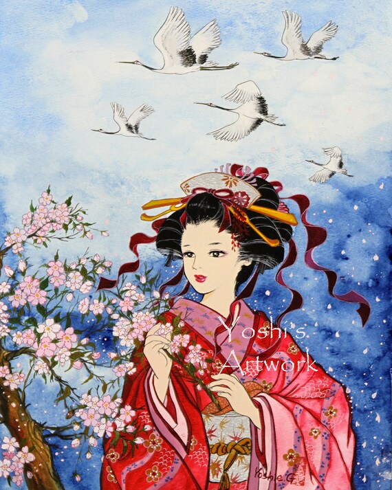 Japanese Art Lady With Cherry Blossom Watercolor Etsy